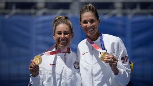 Photos: US tops Tokyo Olympics gold medal count with 39; see every winner April Ross, left, of the United States, and teammate Alix Klineman, display their gold medals after winning a women's beach volleyball Gold Medal match against Australia at the 2020 Summer Olympics, Friday, Aug. 6, 2021, in Tokyo, Japan. (AP Photo/Felipe Dana)