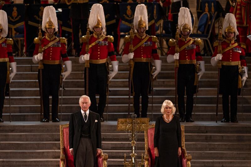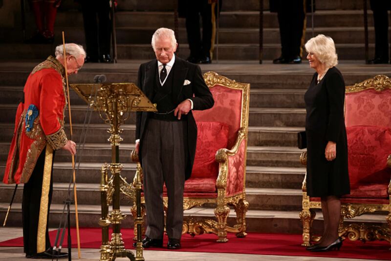 Photos: King Charles III addresses Parliament, vows to follow Queen Elizabeth II's example King Charles III takes part in an address as Camilla, Queen Consort looks on in Westminster Hall on September 12, 2022, in London. (Dan Kitwood/Getty Images)