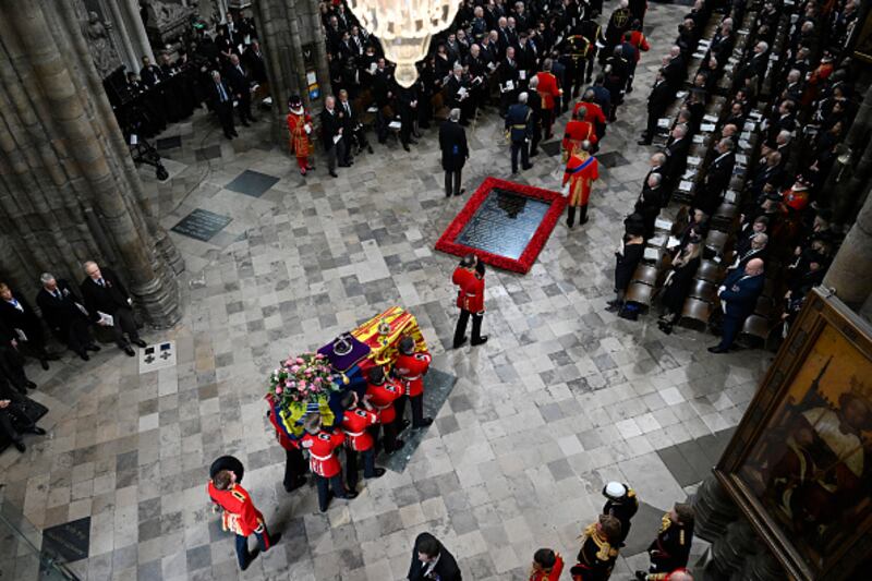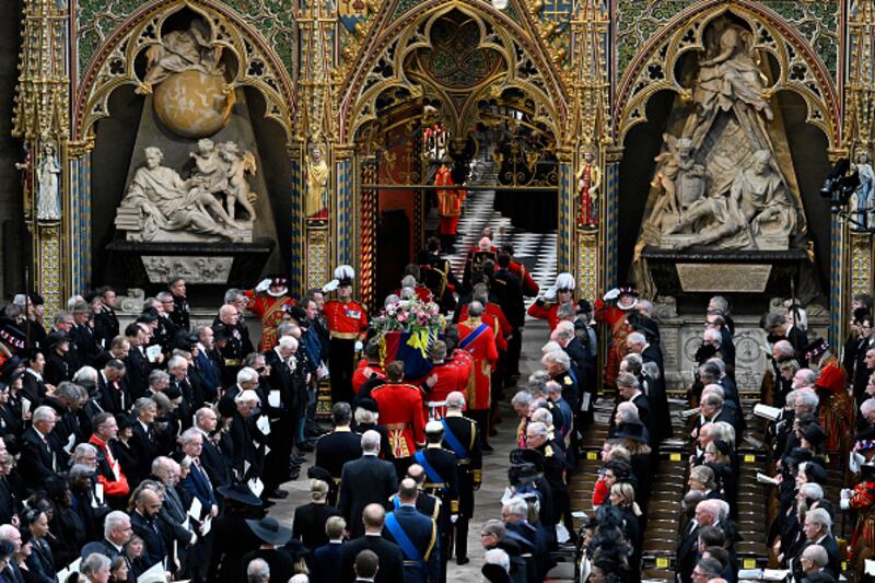 The State Funeral Of Queen Elizabeth II LONDON, ENGLAND - SEPTEMBER 19: The coffin of Queen Elizabeth II with the Imperial State Crown resting on top is carried into Westminster Abbey on September 19, 2022 in London, England. Elizabeth Alexandra Mary Windsor was born in Bruton Street, Mayfair, London on 21 April 1926. She married Prince Philip in 1947 and ascended the throne of the United Kingdom and Commonwealth on 6 February 1952 after the death of her Father, King George VI. Queen Elizabeth II died at Balmoral Castle in Scotland on September 8, 2022, and is succeeded by her eldest son, King Charles III. (Photo by Tristan Fewings/Getty Images) (Tristan Fewings/Getty Images)