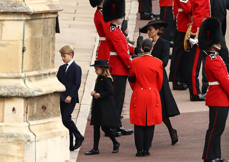 The Committal Service For Her Majesty Queen Elizabeth II WINDSOR, ENGLAND - SEPTEMBER 19: Camilla, Queen Consort, Princess Charlotte of Wales, Prince George of Wales and Catherine, Princess of Wales arrive at Windsor Castle for The Committal Service for Queen Elizabeth II on September 19, 2022 in Windsor, England. The committal service at St George's Chapel, Windsor Castle, took place following the state funeral at Westminster Abbey. A private burial in The King George VI Memorial Chapel followed. Queen Elizabeth II died at Balmoral Castle in Scotland on September 8, 2022, and is succeeded by her eldest son, King Charles III. (Photo by Ryan Pierse/Getty Images) (Ryan Pierse/Getty Images)
