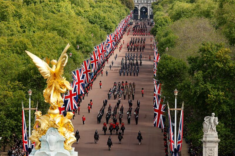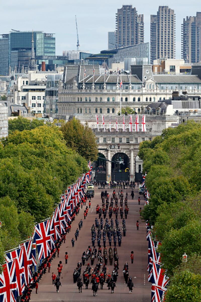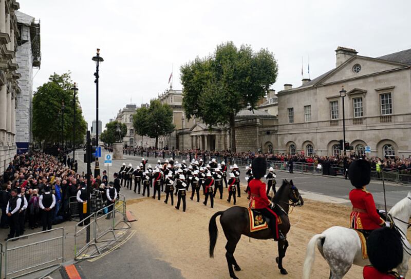 The State Funeral Of Queen Elizabeth II LONDON, ENGLAND - SEPTEMBER 19:Members of a military band pass through Whitehall ahead of the State Funeral of Queen Elizabeth II at Westminster Abbey on September 19, 2022 in London, England. Elizabeth Alexandra Mary Windsor was born in Bruton Street, Mayfair, London on 21 April 1926. She married Prince Philip in 1947 and ascended the throne of the United Kingdom and Commonwealth on 6 February 1952 after the death of her Father, King George VI. Queen Elizabeth II died at Balmoral Castle in Scotland on September 8, 2022, and is succeeded by her eldest son, King Charles III. (Photo by David Davies - WPA Pool/Getty Images) (David Davies/Getty Images)