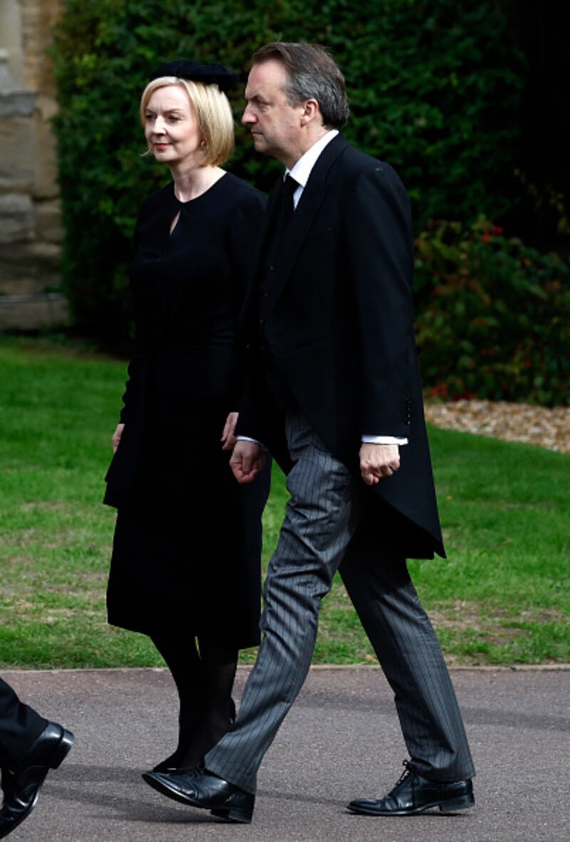 The Committal Service For Her Majesty Queen Elizabeth II WINDSOR, ENGLAND - SEPTEMBER 19: Prime Minister of the United Kingdom, Liz Truss and Hugh O'Leary arrive at St. George's Chapel on September 19, 2022 in Windsor, England. The committal service at St George's Chapel, Windsor Castle, took place following the state funeral at Westminster Abbey. A private burial in The King George VI Memorial Chapel followed. Queen Elizabeth II died at Balmoral Castle in Scotland on September 8, 2022, and is succeeded by her eldest son, King Charles III. (Photo by Jeff J Mitchell/Getty Images) (Jeff J Mitchell/Getty Images)