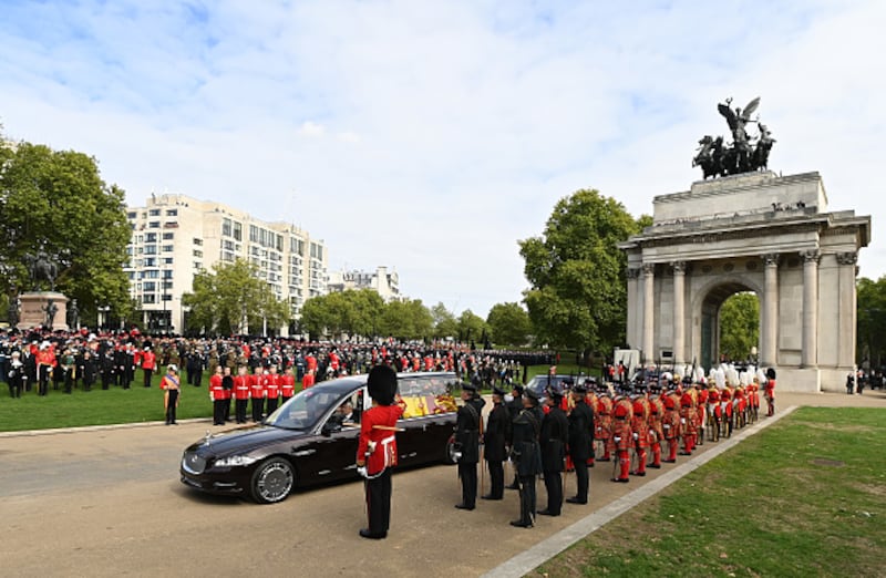 Update 7:50 a.m. EDT Sept. 19: As the procession continues toward Wellington Arch, gun salutes are being fired in Hyde Park, according to the AP.