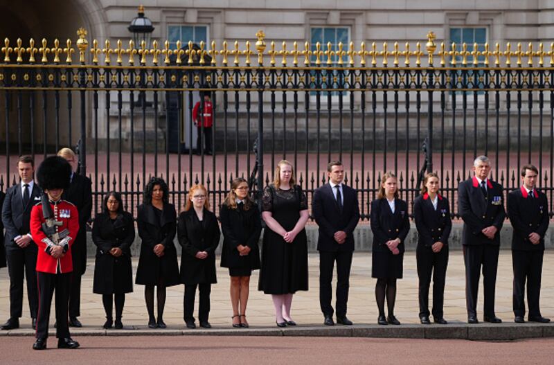 The Committal Service For Her Majesty Queen Elizabeth II WINDSOR, ENGLAND - SEPTEMBER 19: Coldstream guards bow their heads at Windsor Castle on September 19, 2022 in Windsor, England. The committal service at St George's Chapel, Windsor Castle, took place following the state funeral at Westminster Abbey. A private burial in The King George VI Memorial Chapel followed. Queen Elizabeth II died at Balmoral Castle in Scotland on September 8, 2022, and is succeeded by her eldest son, King Charles III. (Photo by Ryan Pierse/Getty Images) (Ryan Pierse/Getty Images)