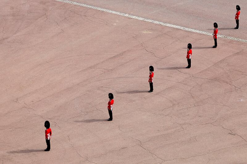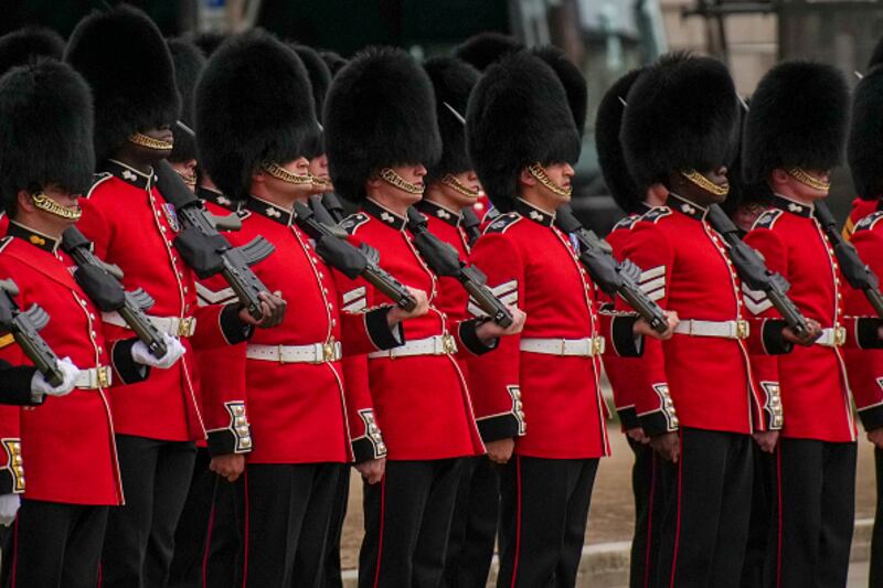 The State Funeral Of Queen Elizabeth II LONDON, ENGLAND - SEPTEMBER 19: Royal guards react ahead of the State Funeral of Queen Elizabeth II at Westminster Abbey on September 19, 2022 in London, England. Elizabeth Alexandra Mary Windsor was born in Bruton Street, Mayfair, London on 21 April 1926. She married Prince Philip in 1947 and ascended the throne of the United Kingdom and Commonwealth on 6 February 1952 after the death of her Father, King George VI. Queen Elizabeth II died at Balmoral Castle in Scotland on September 8, 2022, and is succeeded by her eldest son, King Charles III. (Photo by Emilio Morenatti - WPA Pool/Getty Images) (Emilio Morenatti/Getty Images)