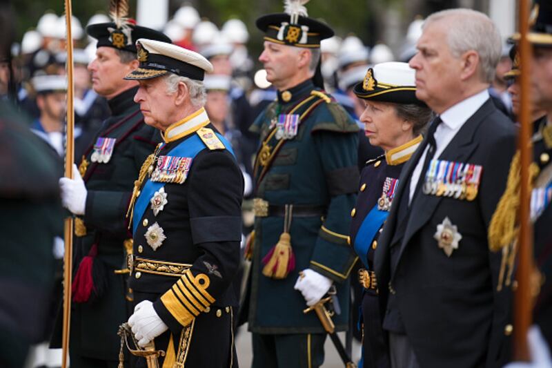 The State Funeral Of Queen Elizabeth II LONDON, ENGLAND - SEPTEMBER 19: King Charles III, Princess Anne, Princess Royal and Prince Andrew, Duke of York follow a gun carriage carrying the coffin of Queen Elizabeth II during the State Funeral of Queen Elizabeth II at Westminster Abbey on September 19, 2022 in London, England. Elizabeth Alexandra Mary Windsor was born in Bruton Street, Mayfair, London on 21 April 1926. She married Prince Philip in 1947 and ascended the throne of the United Kingdom and Commonwealth on 6 February 1952 after the death of her Father, King George VI. Queen Elizabeth II died at Balmoral Castle in Scotland on September 8, 2022, and is succeeded by her eldest son, King Charles III. (Photo by Emilio Morenatti - WPA Pool/Getty Images) (Emilio Morenatti/Getty Images)