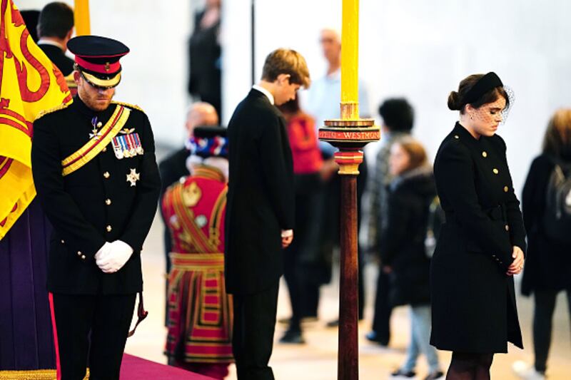 William, Harry, cousins stand vigil by Queen Elizabeth II's coffin LONDON, ENGLAND - SEPTEMBER 17: Prince Harry, Duke of Sussex, Princess Eugenie of York and James, Viscount Severn (C) hold a vigil in honour of Queen Elizabeth II at Westminster Hall on September 17, 2022 in London, England. Queen Elizabeth II's grandchildren mount a family vigil over her coffin lying in state in Westminster Hall. Queen Elizabeth II died at Balmoral Castle in Scotland on September 8, 2022, and is succeeded by her eldest son, King Charles III. (Photo by Aaron Chown-WPA Pool/Getty Images) (Aaron Chown/Getty Images)