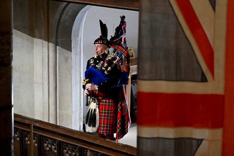 The State Funeral Of Queen Elizabeth II Pipe Major Paul Burns of the Royal Regiment of Scotland helps to close Queen Elizabeth II state funeral with a rendition of the traditional piece Sleep, Dearie, Sleep at Westminster Abbey on September 19, 2022, in London. (Photo by Gareth Cattermole/Getty Images) (GARETH CATTERMOLE/Getty Images)