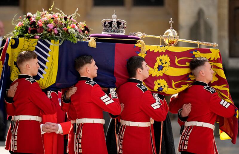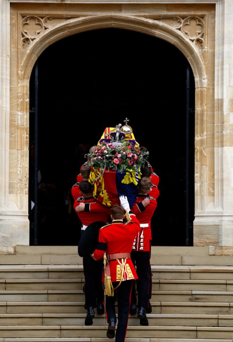 The Committal Service For Her Majesty Queen Elizabeth II WINDSOR, ENGLAND - SEPTEMBER 19: Pall bearers carry the coffin of Queen Elizabeth II with the Imperial State Crown resting on top to St. George's Chapel on September 19, 2022 in Windsor, England. The committal service at St George's Chapel, Windsor Castle, took place following the state funeral at Westminster Abbey. A private burial in The King George VI Memorial Chapel followed. Queen Elizabeth II died at Balmoral Castle in Scotland on September 8, 2022, and is succeeded by her eldest son, King Charles III. (Photo by Jeff J Mitchell/Getty Images) (Jeff J Mitchell/Getty Images)
