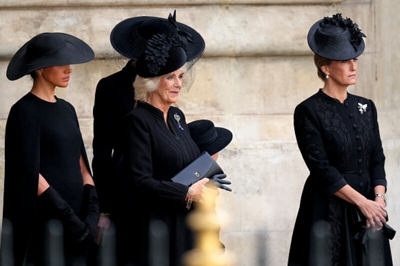 The State Funeral Of Queen Elizabeth II LONDON, ENGLAND - SEPTEMBER 19: Meghan, Duchess of Sussex arrives for the State Funeral of Queen Elizabeth II at Westminster Abbey on September 19, 2022 in London, England. Elizabeth Alexandra Mary Windsor was born in Bruton Street, Mayfair, London on 21 April 1926. She married Prince Philip in 1947 and ascended the throne of the United Kingdom and Commonwealth on 6 February 1952 after the death of her Father, King George VI. Queen Elizabeth II died at Balmoral Castle in Scotland on September 8, 2022, and is succeeded by her eldest son, King Charles III. (Photo by Hannah McKay - WPA Pool/Getty Images) (WPA Pool/Getty Images)
