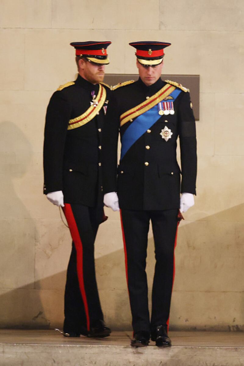 William, Harry, cousins stand vigil by Queen Elizabeth II's coffin LONDON, ENGLAND - SEPTEMBER 17: Prince William, Prince of Wales, Prince Harry, Duke of Sussex arrive to hold a vigil in honour of Queen Elizabeth II at Westminster Hall on September 17, 2022 in London, England. Queen Elizabeth II's grandchildren mount a family vigil over her coffin lying in state in Westminster Hall. Queen Elizabeth II died at Balmoral Castle in Scotland on September 8, 2022, and is succeeded by her eldest son, King Charles III. (Photo by Ian Vogler-WPA Pool/Getty Images) (Ian Vogler/Getty Images)
