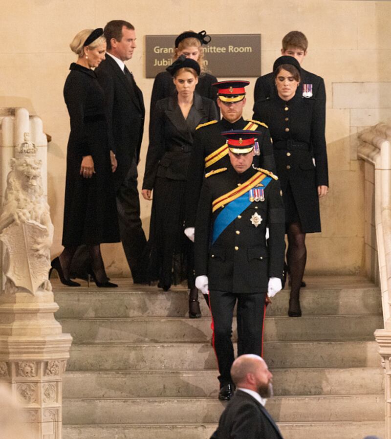 William, Harry, cousins stand vigil by Queen Elizabeth II's coffin LONDON, ENGLAND - SEPTEMBER 17: Prince William, Prince of Wales, Peter Phillips, Zara Tindall, James, Viscount Severn, Lady Louise Windsor, Princess Eugenie of York, Princess Beatrice of York and Prince Harry, Duke of Sussex are seen during a vigil in honour of Queen Elizabeth II at Westminster Hall on September 17, 2022 in London, England. Queen Elizabeth II's grandchildren mount a family vigil over her coffin lying in state in Westminster Hall. Queen Elizabeth II died at Balmoral Castle in Scotland on September 8, 2022, and is succeeded by her eldest son, King Charles III. (Photo by Chris Jackson/Getty Images) (Chris Jackson/Getty Images)