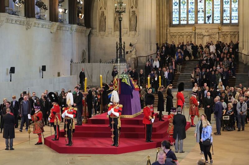 Mourners flock to pay respects to Queen Elizabeth II Members of the public stand in the queue in the early hours of the morning, to pay their respects to the late Queen Elizabeth II, in London on September 18, 2022. - Britain was gearing up Sunday for the momentous state funeral of Queen Elizabeth II as King Charles III prepared to host world leaders and as mourners queued for the final 24 hours left to view her coffin, lying in state in Westminster Hall at the Palace of Westminster. (Photo by Oli SCARFF / AFP) (Photo by OLI SCARFF/AFP via Getty Images) (OLI SCARFF/AFP via Getty Images)