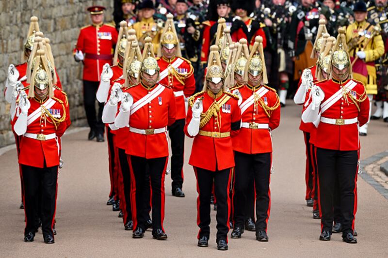 The Committal Service For Her Majesty Queen Elizabeth II WINDSOR, ENGLAND - SEPTEMBER 19: Dismounted detachment of the Household Cavalry are seen at Windsor Castle on September 19, 2022 in Windsor, England. The committal service at St George's Chapel, Windsor Castle, took place following the state funeral at Westminster Abbey. A private burial in The King George VI Memorial Chapel followed. Queen Elizabeth II died at Balmoral Castle in Scotland on September 8, 2022, and is succeeded by her eldest son, King Charles III. (Photo by Leon Neal/Getty Images) (LEON NEAL/Getty Images)