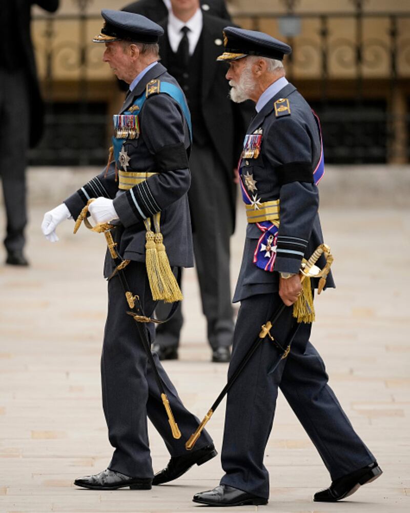 The State Funeral Of Queen Elizabeth II LONDON, ENGLAND - SEPTEMBER 19: Duke of Kent, Prince Edward and Prince Michael of Kent arrive at Westminster Abbey ahead of The State Funeral of Queen Elizabeth II on September 19, 2022 in London, England. Elizabeth Alexandra Mary Windsor was born in Bruton Street, Mayfair, London on 21 April 1926. She married Prince Philip in 1947 and ascended the throne of the United Kingdom and Commonwealth on 6 February 1952 after the death of her Father, King George VI. Queen Elizabeth II died at Balmoral Castle in Scotland on September 8, 2022, and is succeeded by her eldest son, King Charles III. (Photo by Anthony Devlin/Getty Images) (Chris Furlong/Getty Images)