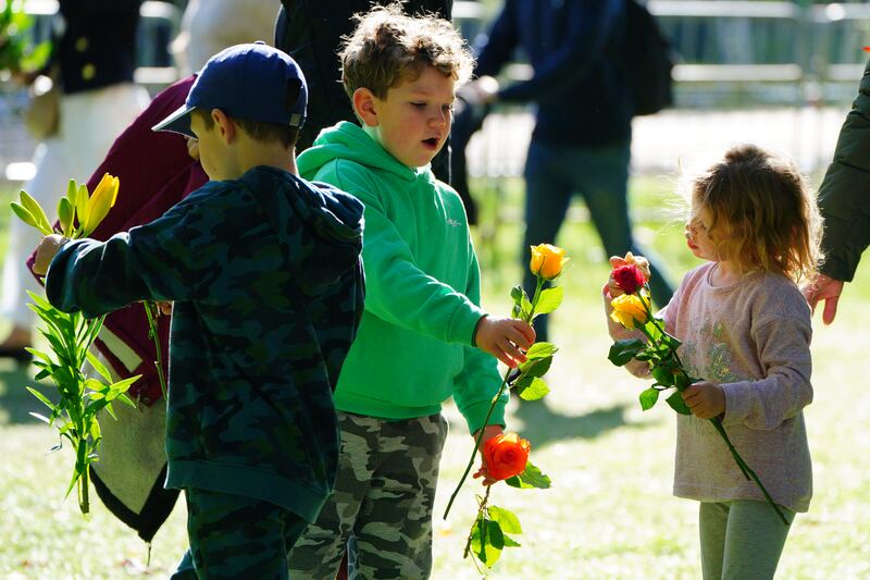 Mourners flock to pay respects to Queen Elizabeth II Children share a bunch of flowers as they arrive on the Long Walk in Windsor to queue in a one-way system to access Windsor Castle where they can pay their respects following the death of Queen Elizabeth II. Picture date: Sunday September 18, 2022. (Photo by Ben Birchall/PA Images via Getty Images) (Ben Birchall - PA Images/PA Images via Getty Images)