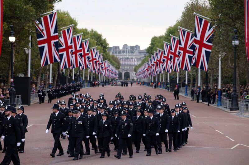 The State Funeral Of Queen Elizabeth II LONDON, ENGLAND - SEPTEMBER 19: A police officer is seen at Westminster Abbey for the State Funeral of Queen Elizabeth II on September 19, 2022 in London, England. Elizabeth Alexandra Mary Windsor was born in Bruton Street, Mayfair, London on 21 April 1926. She married Prince Philip in 1947 and ascended the throne of the United Kingdom and Commonwealth on 6 February 1952 after the death of her Father, King George VI. Queen Elizabeth II died at Balmoral Castle in Scotland on September 8, 2022, and is succeeded by her eldest son, King Charles III. (Photo by Dan Kitwood/Getty Images) (Dan Kitwood/Getty Images)