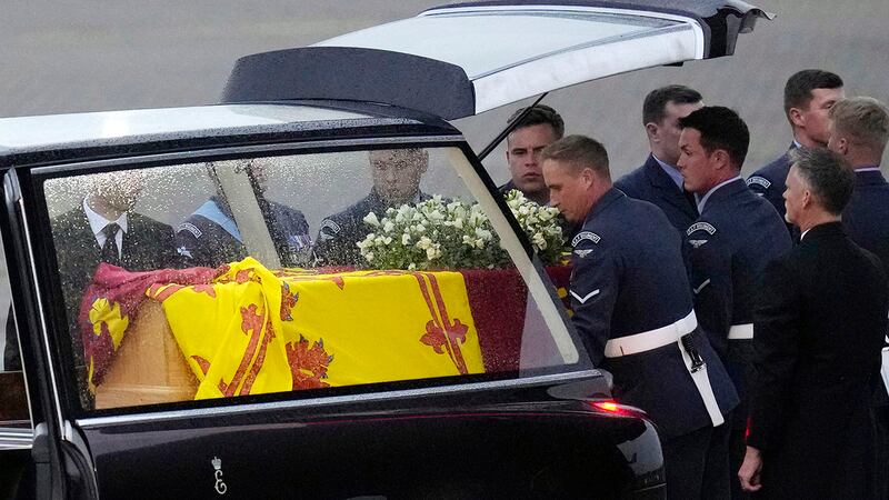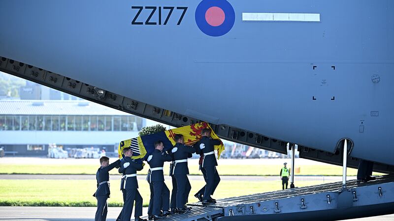 Queen Elizabeth II's coffin leaves Scotland for London Pallbearers from the Queen's Colour Squadron of the Royal Air Force (RAF) carry the coffin of Queen Elizabeth II, draped in the Royal Standard of Scotland, into a RAF C17 aircraft at Edinburgh airport on September 13, 2022 in Edinburgh, Scotland. The coffin carrying Her Majesty Queen Elizabeth II leaves St Giles Church travelling to Edinburgh Airport where it will be flown to London and transferred to Buckingham Palace by road. Queen Elizabeth II died at Balmoral Castle in Scotland on September 8, 2022, and is succeeded by her eldest son, King Charles III. (Photo by Andrew Milligan - WPA Pool/Getty Images) (WPA Pool/Getty Images)