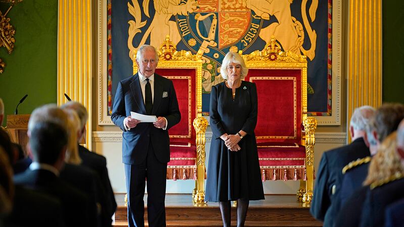 Photos: King Charles III visits Northern Ireland King Charles III, with the Queen Consort, speaks after receiving a Message of Condolence from Alex Maskey, the Speaker of the Northern Ireland Assembly, at Hillsborough Castle, on September 13, 2022 in Hillsborough, United Kingdom. King Charles III is visiting Northern Ireland for the first time since ascending to the throne following the death of his mother, Queen Elizabeth II, who died at Balmoral Castle on September 8, 2022. (Photo by Niall Carson - WPA Pool/Getty Images) (WPA Pool/Getty Images)