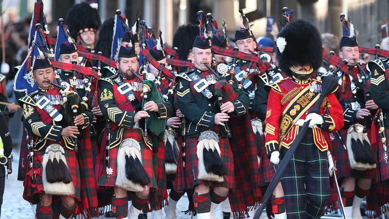 Queen Elizabeth II's coffin leaves Scotland for London Pipers march on September 13, 2022 in Edinburgh, Scotland. The coffin carrying Her Majesty Queen Elizabeth II leaves St Giles Church travelling to Edinburgh Airport where it will be flown to London and transferred to Buckingham Palace by road. Queen Elizabeth II died at Balmoral Castle in Scotland on September 8, 2022, and is succeeded by her eldest son, King Charles III. (Photo by Robert Perry/Getty Images) (Robert Perry/Getty Images)