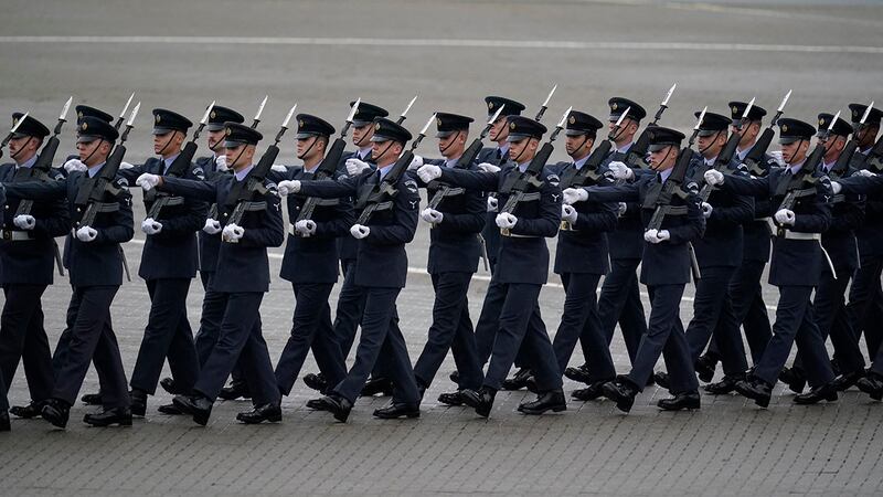 Queen Elizabeth II's coffin arrives in London The bearer party from the Queen's Colour Squadron (63 Squadron RAF Regiment) march into position as they await the coffin of Queen Elizabeth II to arrive at RAF Northolt, west London, from where it will be taken to Buckingham Palace, London, to lie at rest overnight in the Bow Room on September 13, 2022 in London, England. The coffin carrying Her Majesty Queen Elizabeth II leaves St Giles Church travelling to Edinburgh Airport where it will be flown to London and transferred to Buckingham Palace by road. Queen Elizabeth II died at Balmoral Castle in Scotland on September 8, 2022, and is succeeded by her eldest son, King Charles III. (Photo by Andrew Matthews - WPA Pool/Getty Images) (WPA Pool/Getty Images)