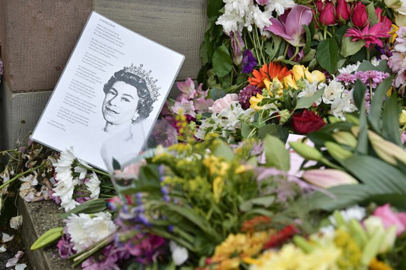 Photos: King Charles III visits Northern Ireland A portrait of the late Queen Elizabeth II sits amongst floral tributes at Hillsborough Castle on September 13, 2022, in Belfast, Northern Ireland. (Charles McQuillan/Getty Images)