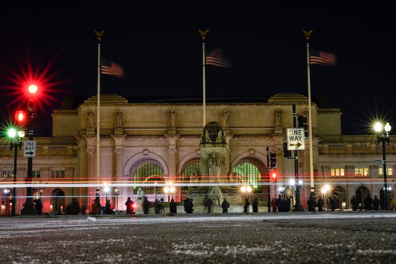 Photos: Rare snowy owl visits D.C. monuments In a long exposure photo, a rare snowy owl takes flight from atop the large marble orb of the Christopher Columbus Memorial Fountain at the entrance to Union Station in Washington, Saturday, Jan. 8, 2022. (AP Photo/Carolyn Kaster) (Carolyn Kaster/AP)