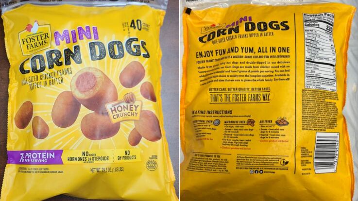 The corn dogs affected by the recall are the 1.83-pound bag that says “Foster Farms mini corn dogs bite-sized chicken franks dipped in batter honey crunchy flavor,” FSIS said. The lot codes are 1231144 and 223114. The best, if used by date, is April 23, 2024.