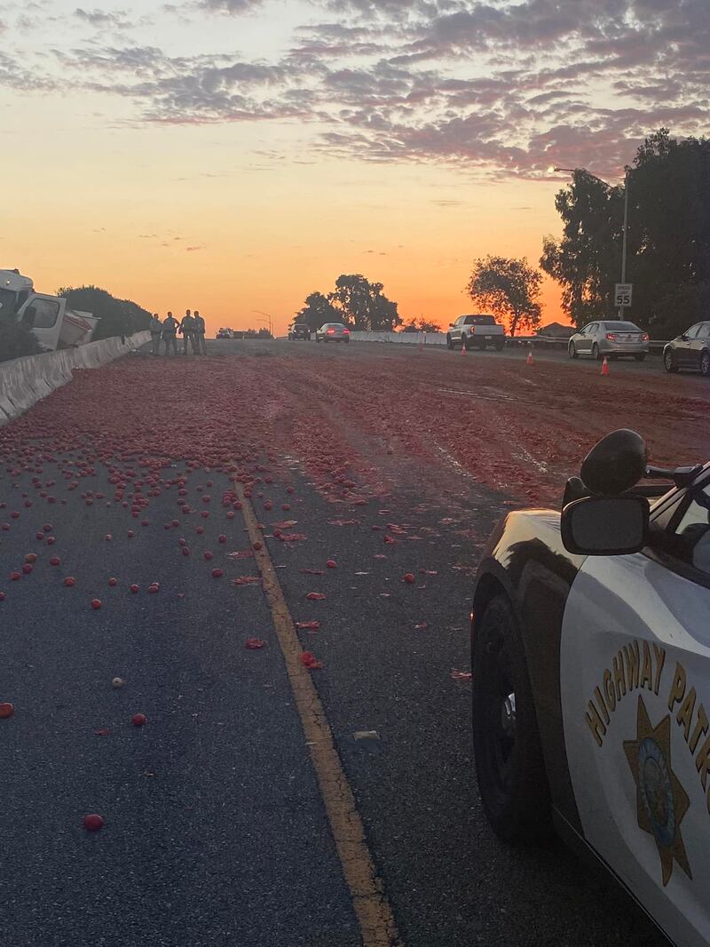 California Highway Patrol said in a Facebook post that a semitruck carrying tomatoes was involved in a crash involving several vehicles and went through the center divider. When the truck overturned, the load of tomatoes fell into the road, creating a disaster.