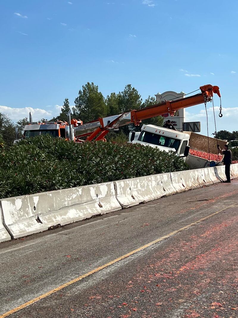 Photos shared by CHP show the road’s asphalt smeared red by the tomatoes in the road, as well as a crane working to right the toppled truck.