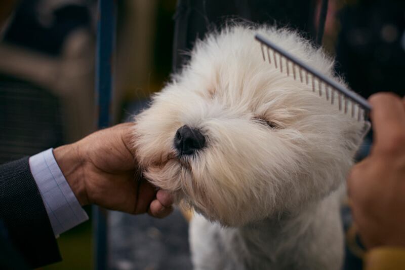 Westminster Kennel Club NEW YORK, NEW YORK - MAY 14: A West highland white terrier dog gets prepared inside the grooming tent during the 148th Annual Westminster Kennel Club Dog Show at the USTA Billie Jean King National Tennis Center on May 14, 2024 in New York City. (Photo by Andres Kudacki/Getty Images) (Andres Kudacki/Getty Images)