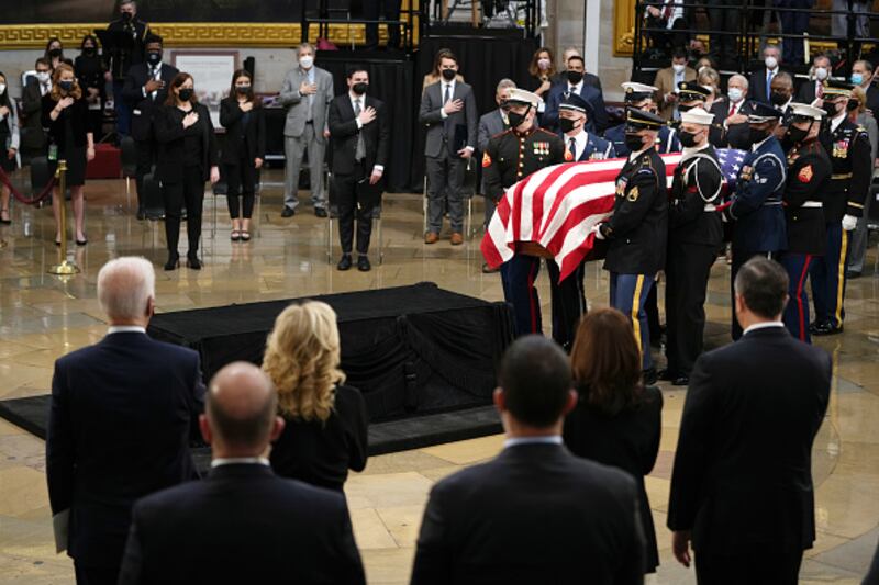 Bob Dole Lies In State At U.S. Capitol U.S. President Joe Biden delivers remarks as the casket of former U.S. Senate Majority Leader Bob Dole (R-KS) lies in state in the Rotunda of the U.S. Capitol on December 9, 2021 in Washington, DC. The former Senate Majority Leader and Republican Presidential nominee, will lie in state in the Capitol Rotunda all day before being taken to the National Cathedral for a funeral service. (Photo by Jonathan Ernst-Pool/Getty Images) (JONATHAN ERNST/Getty Images)
