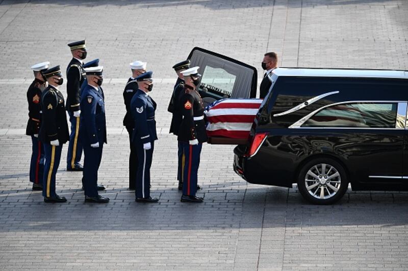 Sen. Bob Dole funeral Elizabeth Dole accompanied with Joint Chiefs of Staff Chairman Marine General Mark Milley and Robin Dole watch a military honor guard carries the casket of Sen. Bob Dole (R-KS) is seen in a hearse after lying in state at the U.S. Capitol on December 10, 2021 in Washington, DC. Dole, a veteran who was severely injured in World War II, was a Republican Senator from Kansas from 1969 to 1996. He ran for president three times and became the Republican nominee for president in 1996. (Photo by Pool/Getty Images) (Greg Nash/Getty Images)