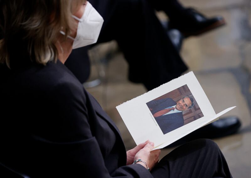 Bob Dole Lies In State At U.S. Capitol A mourner holds a program showing former U.S. Senate Majority Leader Bob Dole, prior to a congressional ceremony to honor Dole, who will lie in state in the U.S. Capitol Rotunda on December 9, 2021 in Washington, DC. The former Senate Majority Leader and Republican Presidential nominee, will lie in state in the Capitol Rotunda all day before being taken to the National Cathedral for a funeral service. (Photo by Jonathan Ernst-Pool/Getty Images) (JONATHAN ERNST/Getty Images)