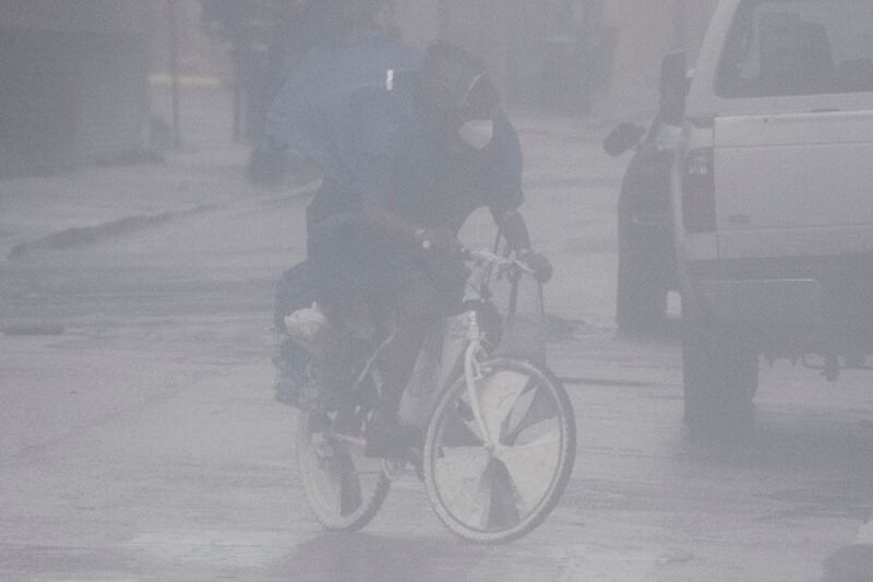 Hurricane Ida aftermath A cyclist wears a face mask as they ride through rain and high winds on Canal Street in New Orleans, Louisiana on August 29, 2021 during Hurricane Ida. - Hurricane Ida made landfall as "an extremely dangerous" Category 4 storm in Louisiana on Sunday, according to the National Hurricane Center, 16 years to the day after Hurricane Katrina devastated the region. "Extremely dangerous Category 4 Hurricane Ida makes landfall near Port Fourchon, Louisiana," the NHC wrote in an advisory. Ida struck the port, which is located 100 miles (160 kilometers) directly south of New Orleans, at 1655 GMT, packing maximum sustained winds estimated at 150 miles per hour. (Photo by Patrick T. FALLON / AFP) (Photo by PATRICK T. FALLON/AFP via Getty Images) (PATRICK T. FALLON/AFP via Getty Images)