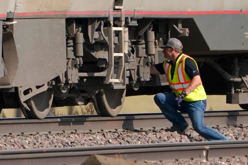 Amtrak derailment A worker peers under an Amtrak train engine, Sunday, Sept. 26, 2021, that was part of a train that derailed Saturday just west of Joplin, Mont. The westbound Empire Builder was en route to Seattle from Chicago, with two locomotives and 10 cars. (AP Photo/Ted S. Warren) (Ted S. Warren/AP)