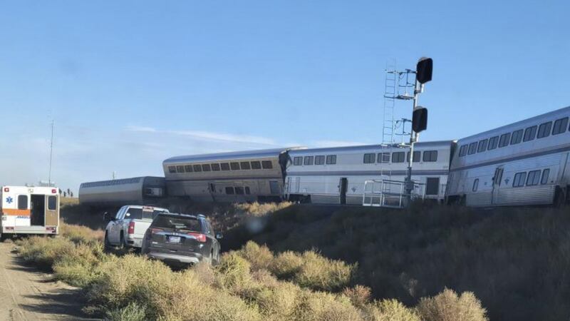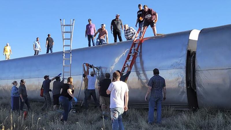 Amtrak derailment Amtrak train cars are shown, Sunday, Sept. 26, 2021, that were part of a train that derailed Saturday just west of Joplin, Mont., killing three people and injuring others. The westbound Empire Builder was en route to Seattle from Chicago, with two locomotives and 10 cars. (AP Photo/Ted S. Warren) (Ted S. Warren/AP)