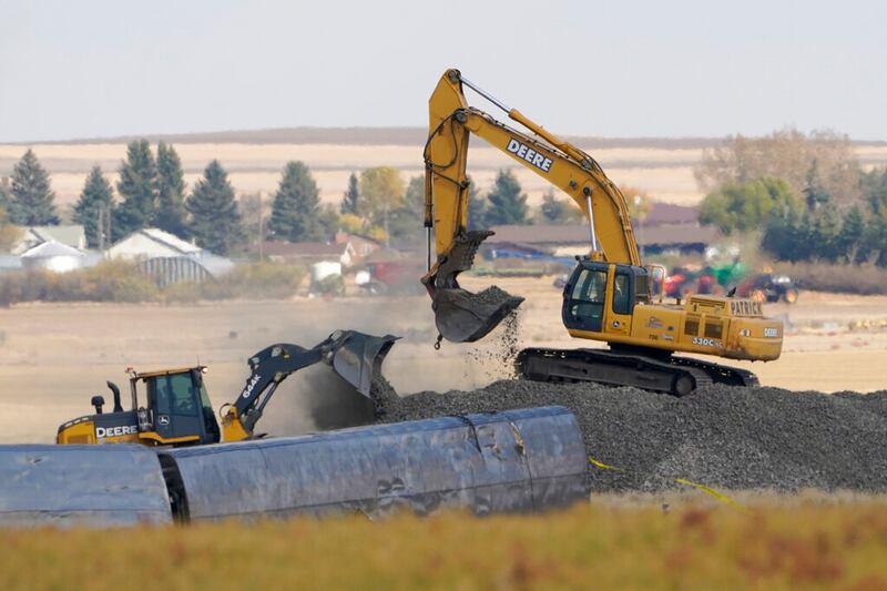 Amtrak derailment Heavy equipment moves gravel Sunday, Sept. 26, 2021, next to cars from an Amtrak train that derailed the day before just west of Joplin, Mont., killing three people and injuring others. The westbound Empire Builder was en route to Seattle from Chicago, with two locomotives and 10 cars. (AP Photo/Ted S. Warren) (Ted S. Warren/AP)