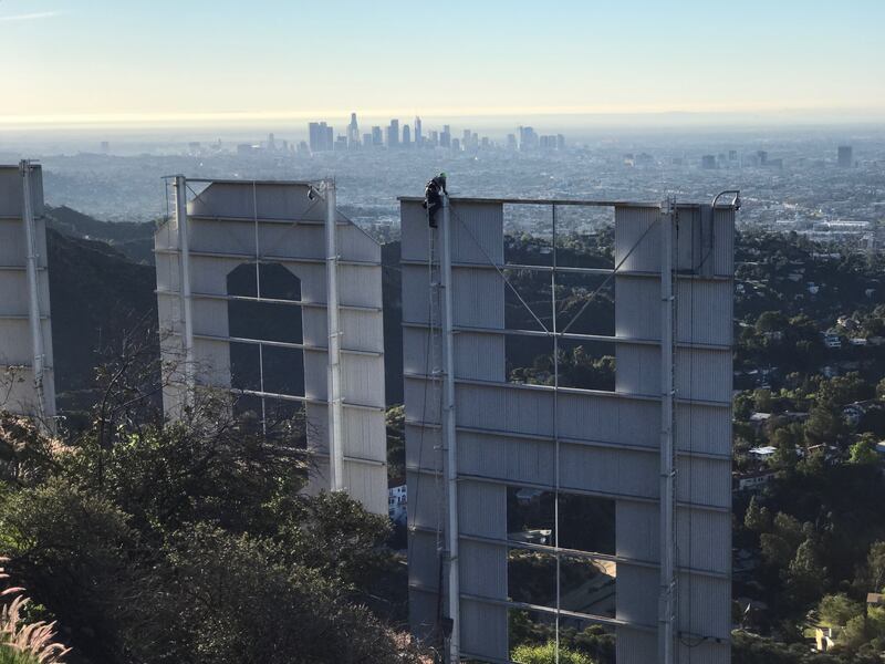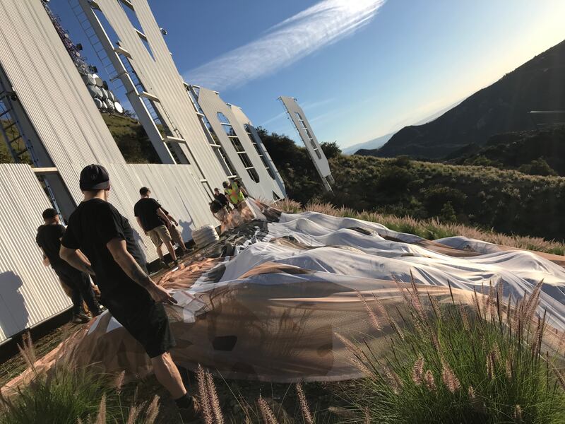 Photos: The Hollywood sign becomes Rams House Workers change the letters in the iconic "Hollywood" sign to read "Rams House" in honor of the Los Angeles Rams' Super Bowl Win. (Courtesy of the Hollywood Sign Trust and Photographer David Livingston/Courtesy of the Hollywood Sign Trust and Photographer David Livingston)