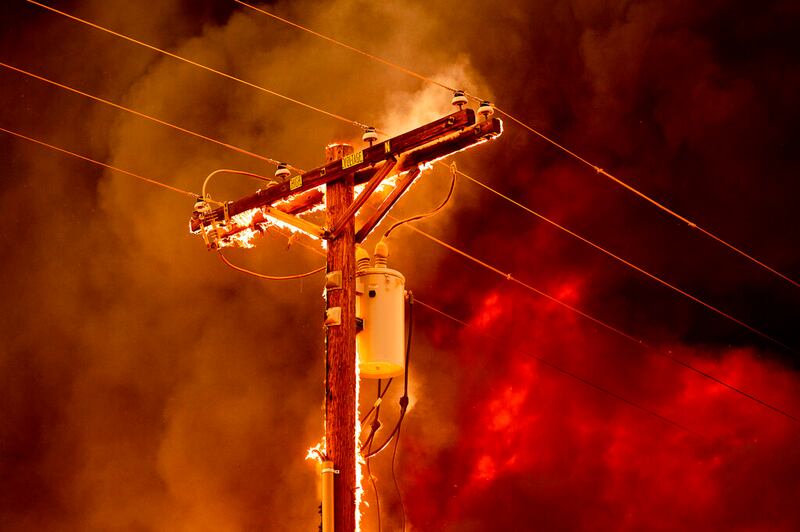 Beckwourth Complex Fire Fire burns along a power pole as the Sugar Fire, part of the Beckwourth Complex Fire, tears through central Doyle, Calif., on Saturday, July 10, 2021. (AP Photo/Noah Berger) (Noah Berger/AP)