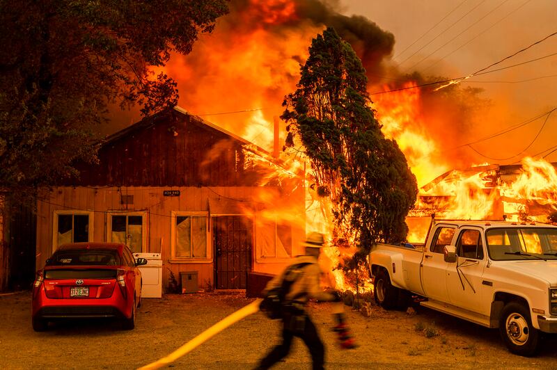 Beckwourth Complex Fire A firefighter sprays water while trying to stop the Sugar Fire, part of the Beckwourth Complex Fire, from spreading to neighboring homes in Doyle, Calif., Saturday, July 10, 2021. Pushed by heavy winds amid a heat wave, the fire came out of the hills and destroyed multiple residences in central Doyle. (AP Photo/Noah Berger) (Noah Berger/AP)