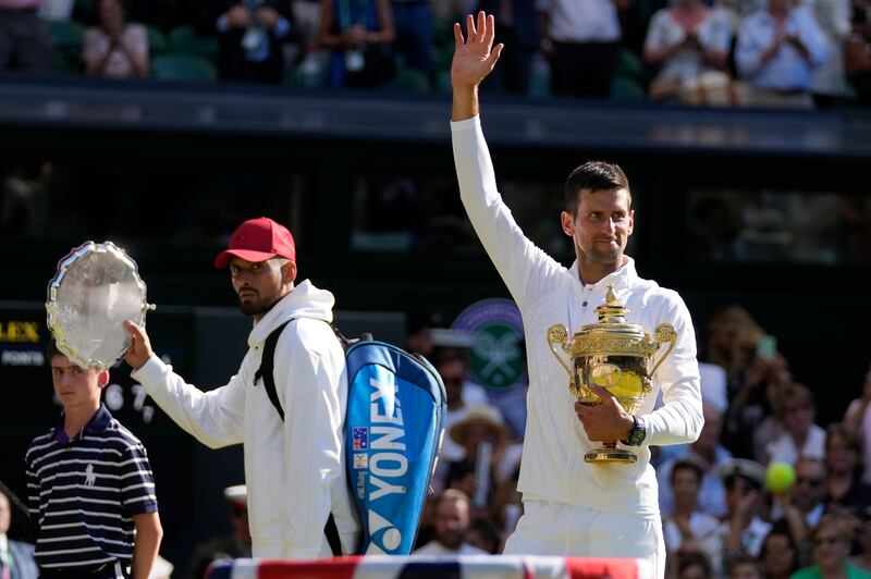 Photos: Novak Djokovic defeats Nick Kyrgios to win Wimbledon 2022 final Serbia's Novak Djokovic, right, holds the winners trophy as he celebrates after beating Australia's Nick Kyrgios, left, to win the final of the men's singles on Day 14 of the Wimbledon tennis championships in London, Sunday, July 10, 2022. (AP Photo/Alastair Grant)