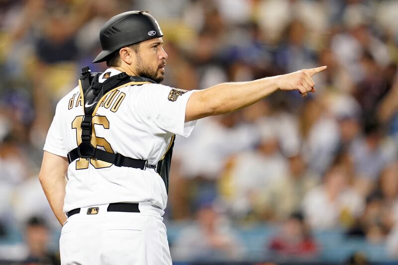 Photos: American League wins 9th straight MLB All-Star Game National League catcher Travis d'Arnaud, of the Atlanta Braves, points from home plate during the eighth inning of the MLB All-Star baseball game against the American League, Tuesday, July 19, 2022, in Los Angeles. (AP Photo/Abbie Parr)