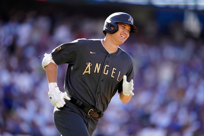 Photos: American League wins 9th straight MLB All-Star Game American League's Shohei Ohtani, of the Los Angeles Angels, smiles as he round first base with a single during the first inning of the MLB All-Star baseball game against the American League, Tuesday, July 19, 2022, in Los Angeles. (AP Photo/Abbie Parr)