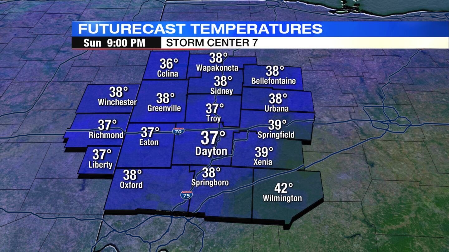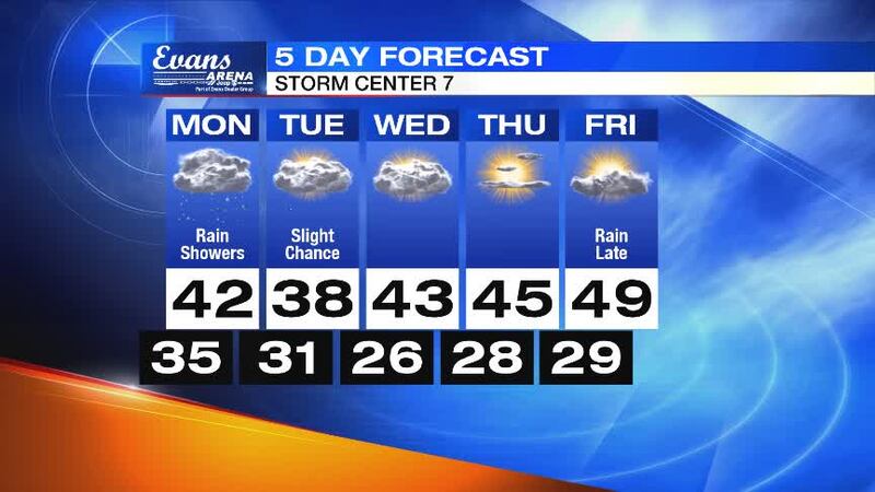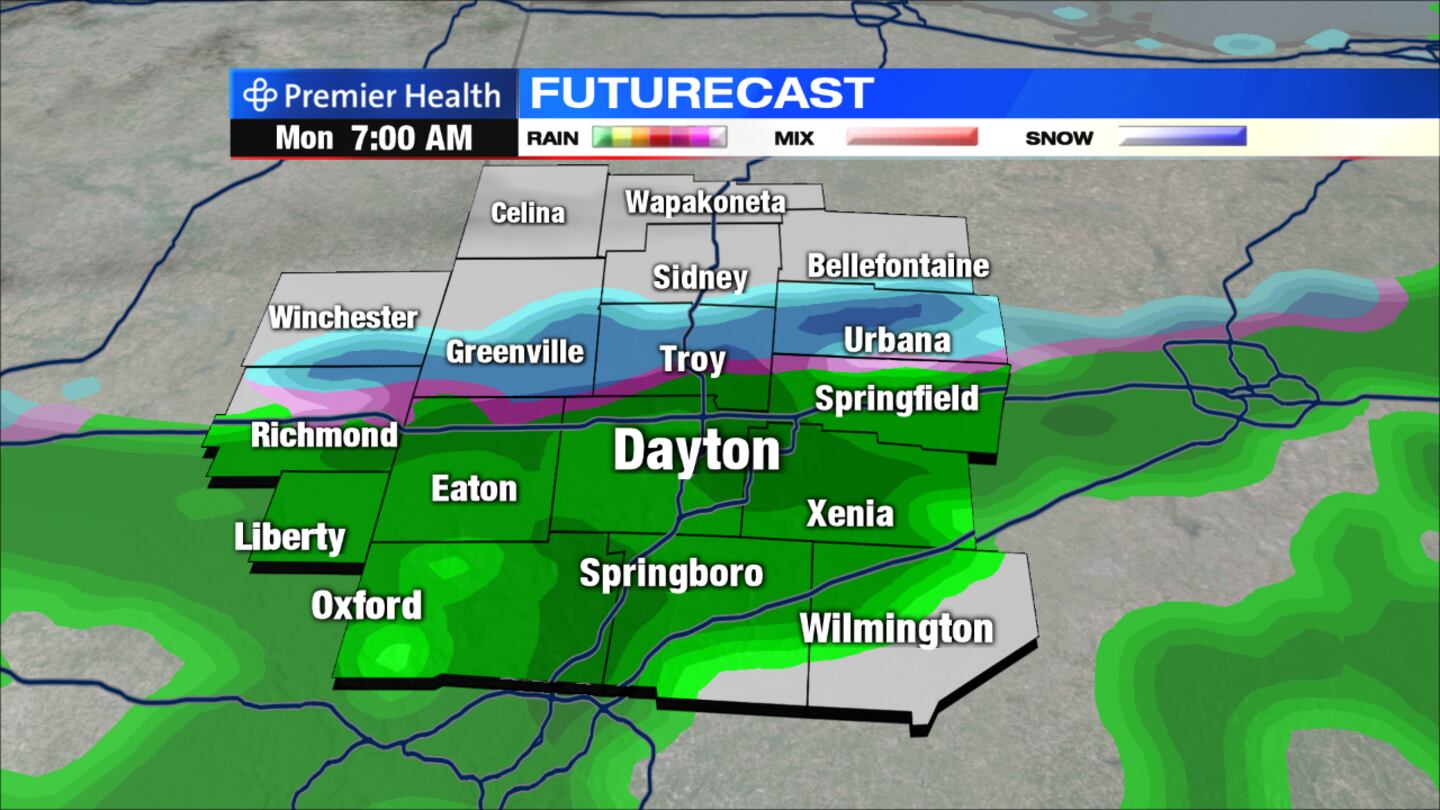 Monday: AM fog possible. Cloudy with light rain showers possible especially in the morning. Possibly a wintry mix to the north of Dayton. Highs in the lower to mid 40s.