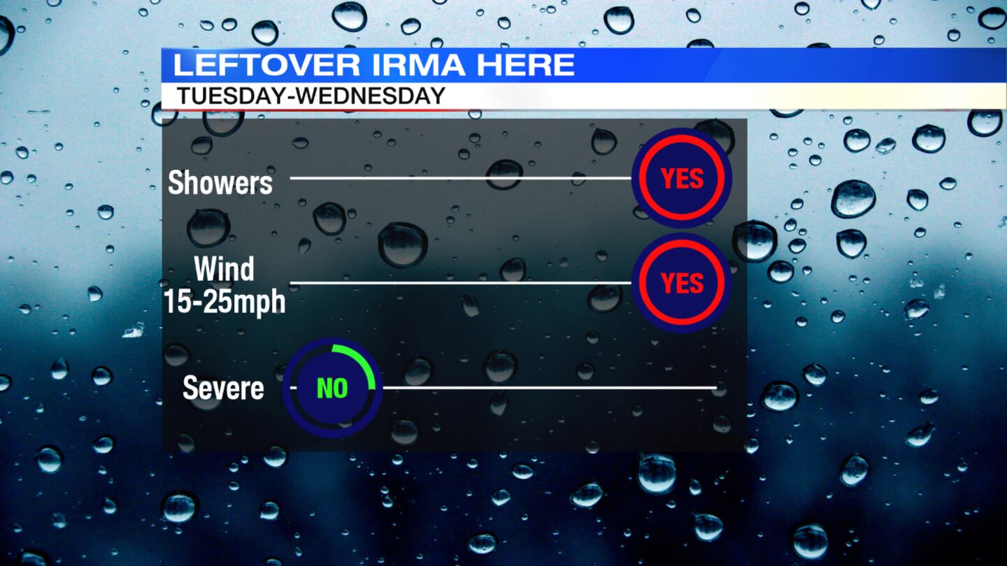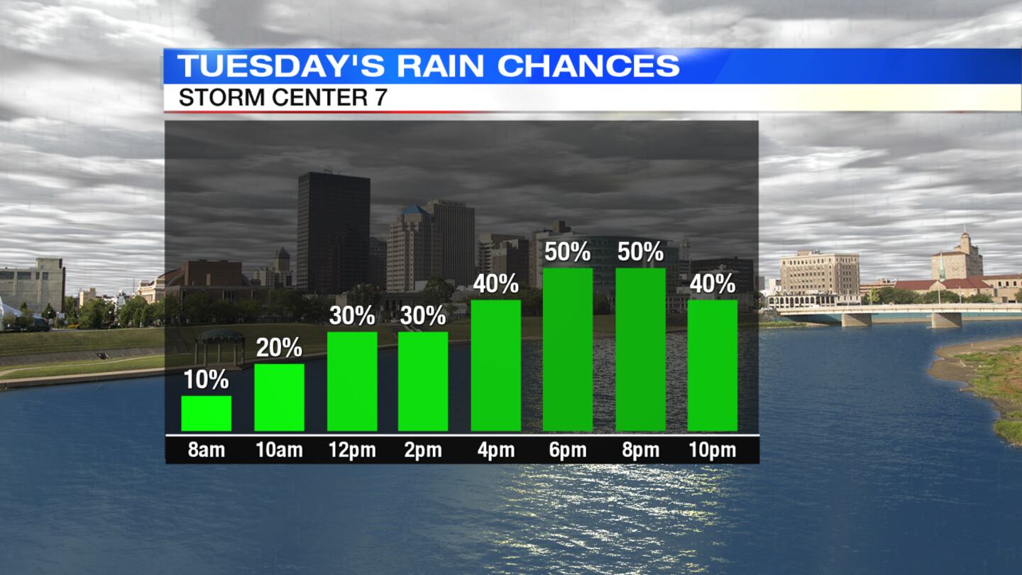 TUESDAY: Showers will develop as we head through the day, increasing in coverage by late evening. Highs will be in the lower 70s.