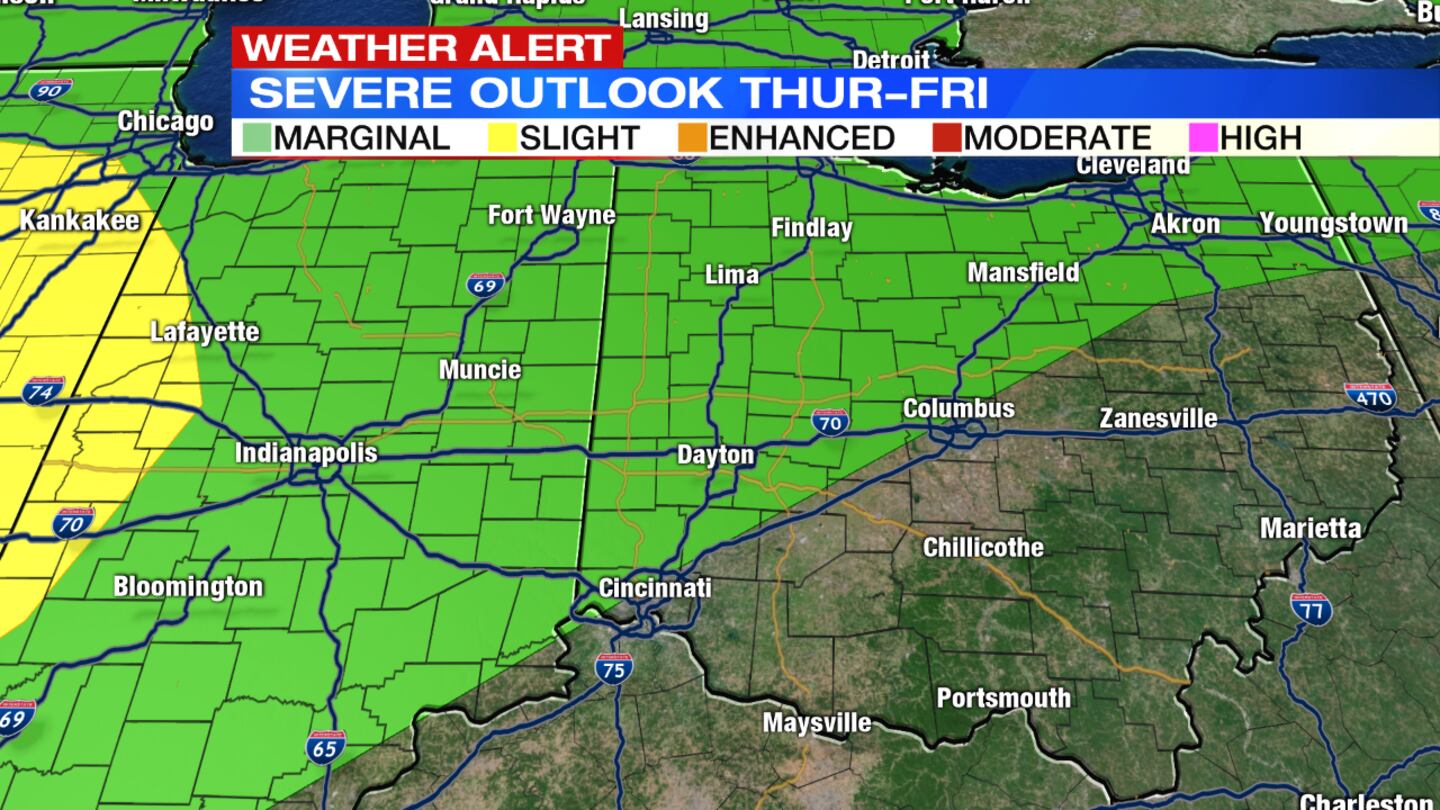 Thursday: Expect partly sunny skies with a chance for showers and storms. A few storms could be strong, especially north and west into the evening. Highs will be in the upper 70s with breezy conditions.
