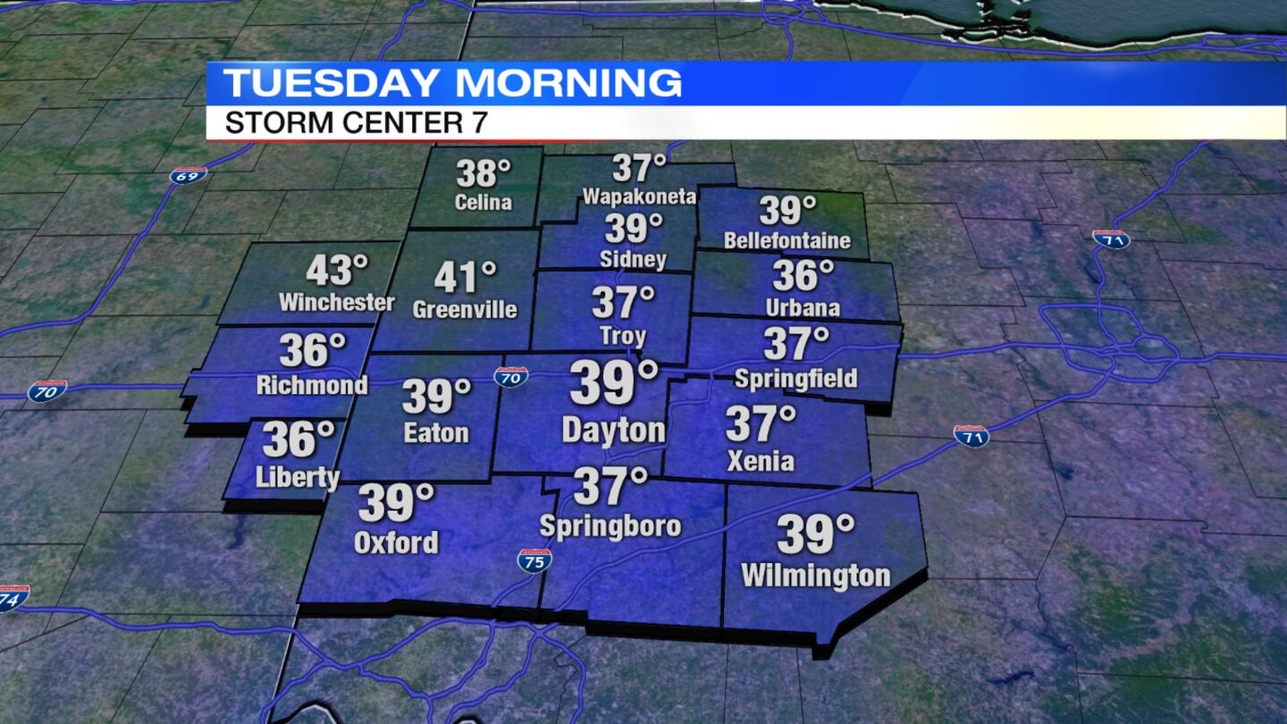 Tonight: Skies will clear tonight as temperatures drop through the 50s to an overnight low in the upper 30s in most places. Some areas north and east of the Dayton metro area could drop into the middle 30s.