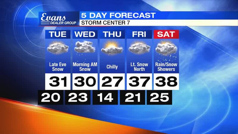 Friday: Lots of clouds are expected with a chance for snow showers, mainly across the northern Miami Valley. Highs will be in the upper 30s.