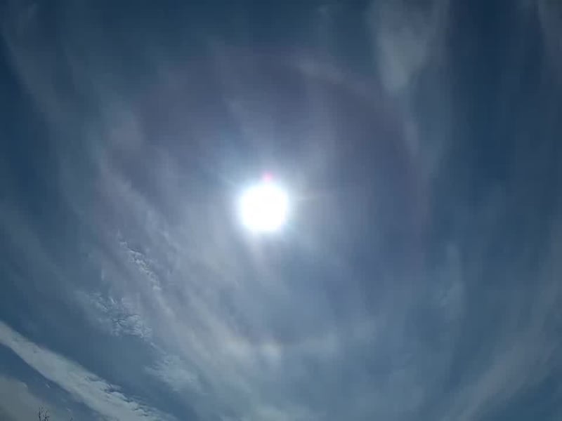 Cirrus clouds are made up of ice crystals. The sunlight is refracted off of the ice crystals causing the halo around the sun. Sun halos are bright and can have color to them as well.